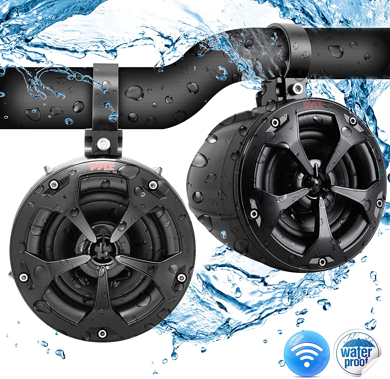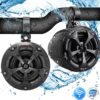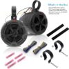 Pyle Model : PLUTV43BTA4’’ Off-Road PowerSport Marine Speakers4’’ Waterproof Rated Off-Road Bluetooth Speakers – Amplified Vehicle Speaker System for ATV, UTV, 4×4, Jeep (800 Watt)Features:Pro Audio PowerSport SpeakersAmplified (Active + Passive) Speaker SystemBluetooth Wireless Music Streaming AbiltiyBridged Sound System: (2) x 4.0” Woofers + (2) x 0.5” TweetersMarine Grade Waterproof Rated ConstructionWeatherproof & Water-Resistant Housing2-Way Full Range Stereo Sound ReproductionBuilt-in Digital Sound Processing AmplifierIntegrated Speaker Power & Wiring HarnessCompact Size & High-Powered OutputImpressive Bass ResponseAux (3.5mm) Input JackConnect & Stream Audio from External DevicesSleek Design, Machine Molded Speaker Cabinet HousingRugged, Universal Mount Bracket Design for Roll-Bar / Roll-CageUsed for Off-Road Outdoor Vehicles: ATV, UTV, 4×4, Jeeps, Marine Watercraft