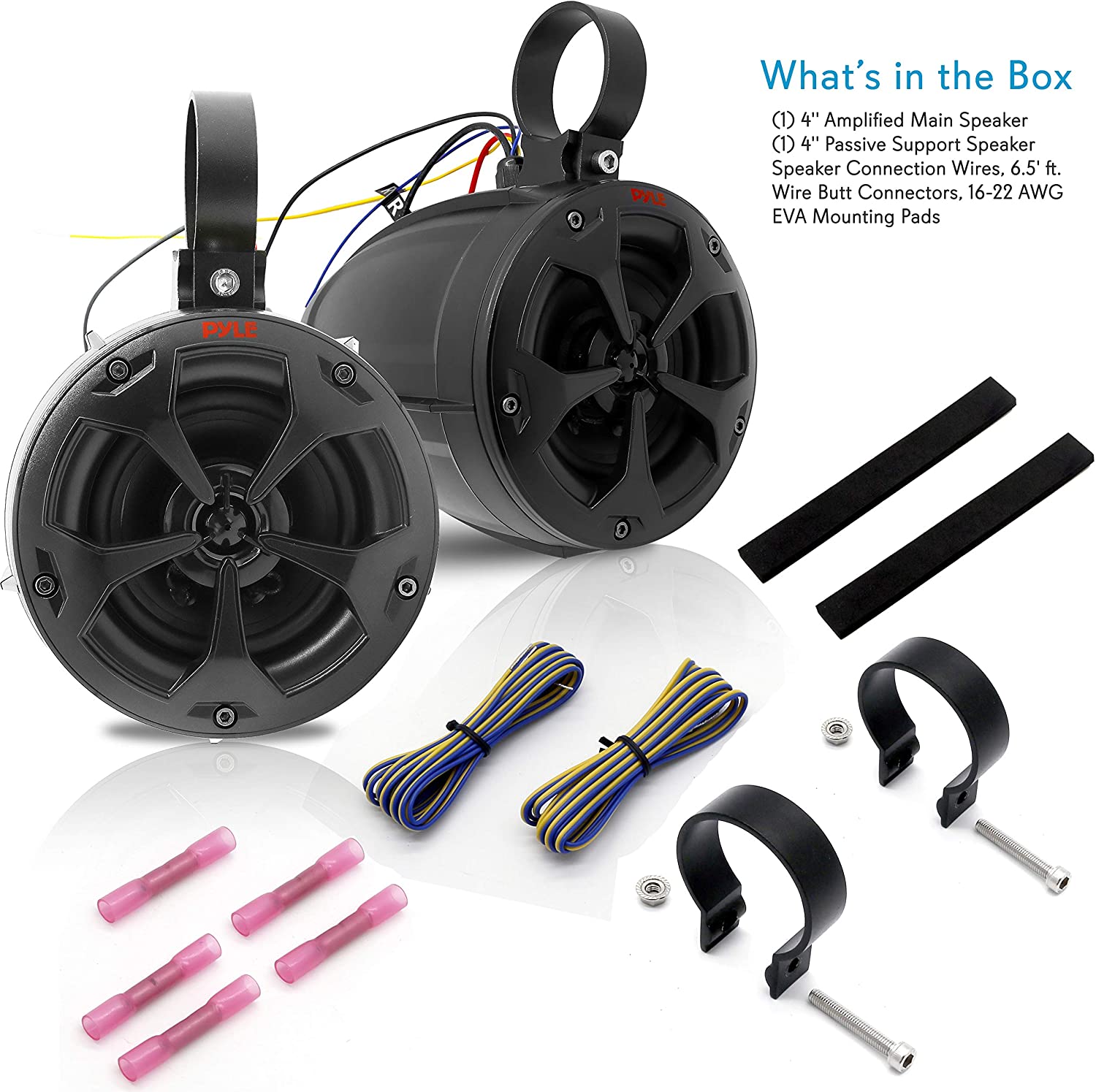 What’s in the Box:(1) 4” Amplified Main Speaker(1) 4” Passive Support SpeakerSpeaker Connection Wires, 6.5′ ft.Wire Butt Connectors, 16-22 AWGEVA Mounting Pads