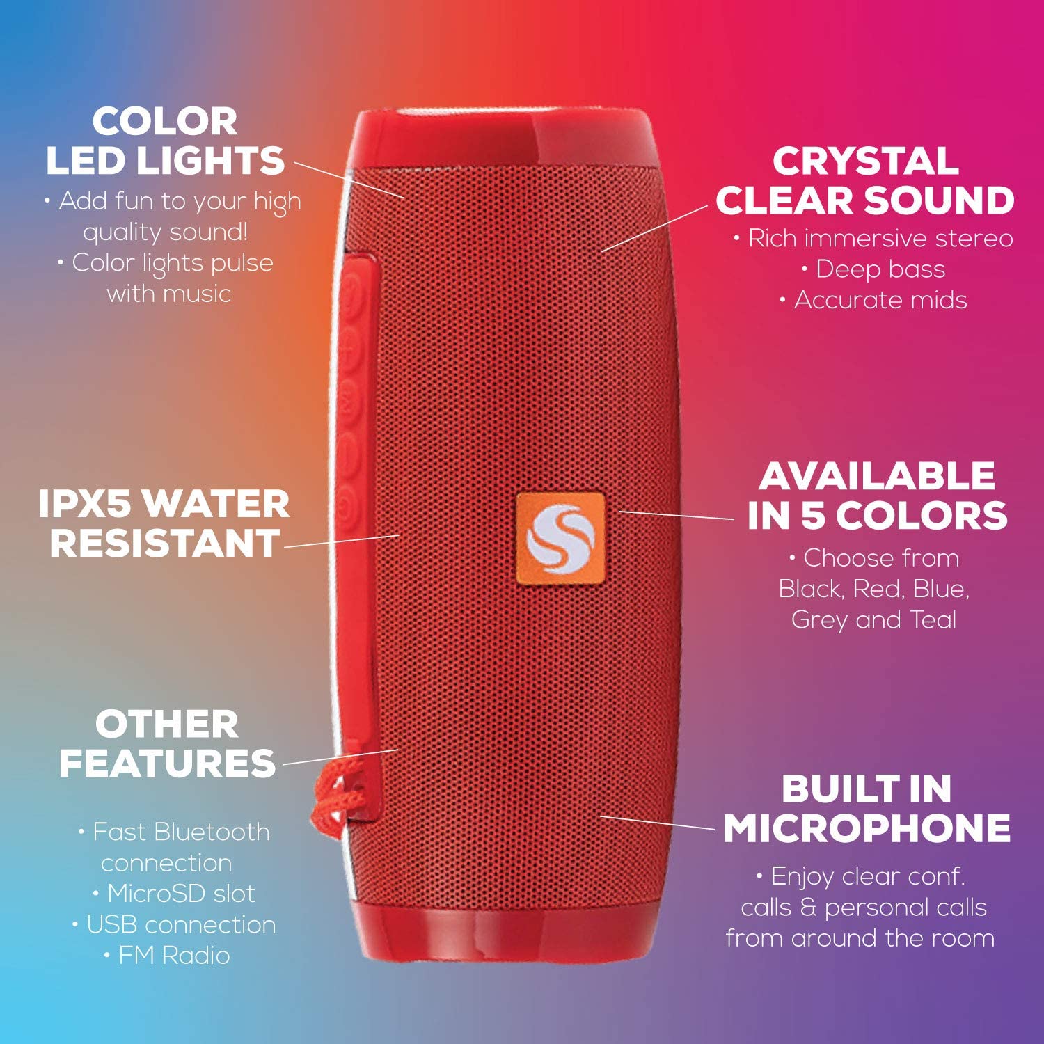 Description: SilverOnyx portable Bluetooth speaker provides powerful, crystal clear stereo sound, deep bass, and accurate mids and highs. This compact, Ipx5 waterproof speaker is powered by a long lasting rechargeable Li ion battery, so you can have music with you all day, wherever life takes you. Light show: lighting can pulse to your music and add some color to your environment. Built in microphone allows you to easily take personal and conference calls with clear quality. Ipx5 Water Resistant technology makes is perfect for the beach, pool, shower or anywhere else you go. Can resist indirect water spray and splash, but cannot be submerged. Bluetooth 4.2 technology provides longer range, higher quality and faster connection. Features: Bluetooth 4.2 Led Lights Ipx5 Water Resistant Microphone MicroSd 3.5mm Aux In Usb Radio Specifications: Range: 33 feet Battery: 3.7V 1200mAh Speaker Driver: 57mm x 2 Frequency: 120Hz to 20Khz Unit Size: 72.6 x 72.9 x 178.7mm Unit Weight: 490g What’s in the Box: 1 x SilverOnyx 157 Speaker 1 x 3.5mm Aux Line In Cable.