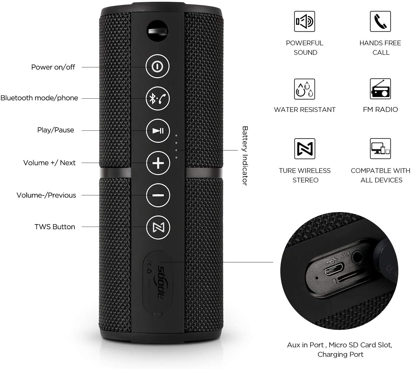 Sbode Bluetooth Speakers Portable Waterproof Outdoor Wireless Speaker Enhanced Bass, Sync Together, Built in Mic, TF Card, Auto Off, FM Radio for Beach, Shower & Home